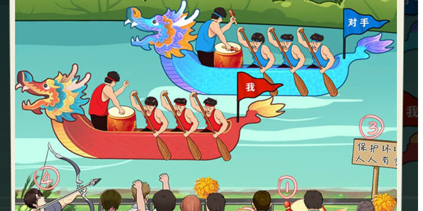 2。点击岸上的广告牌保护环境,然后对着太阳射出岸上观众手中的箭,最后画出来露出鱼嘴,把珠子从鱼嘴拖到红色龙船的龙口;最后,红色龙舟可以赢得比赛。